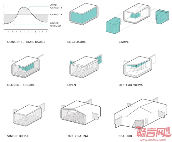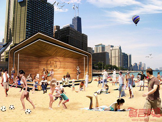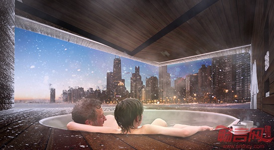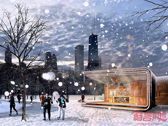 在芝加哥短暂、宜人的夏季中,每天有6万到7万人参观湖滨。冬季来临时,游人一去无踪,使这一区域成为荒凉的冰原。Klye Bigart设计的Urban Therme项目,采用古罗马水疗建筑类型,凉亭结构让游人和市民尽情享受湖畔美丽的风光。曲面和缓的建筑外形提供冷热水浴、干式桑拿等体验,无需设施的更新。