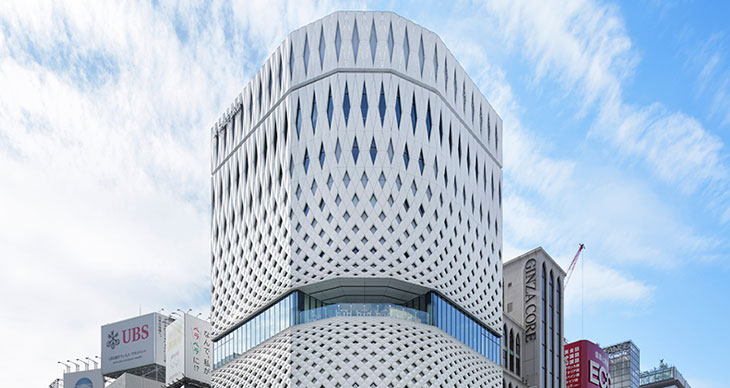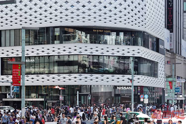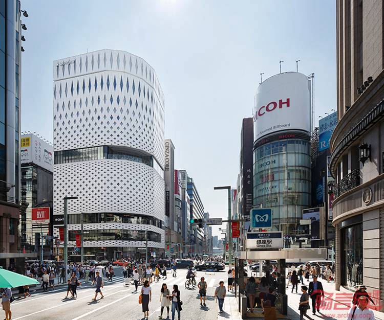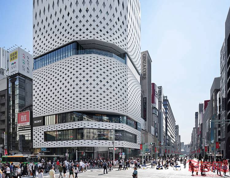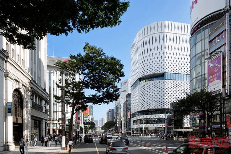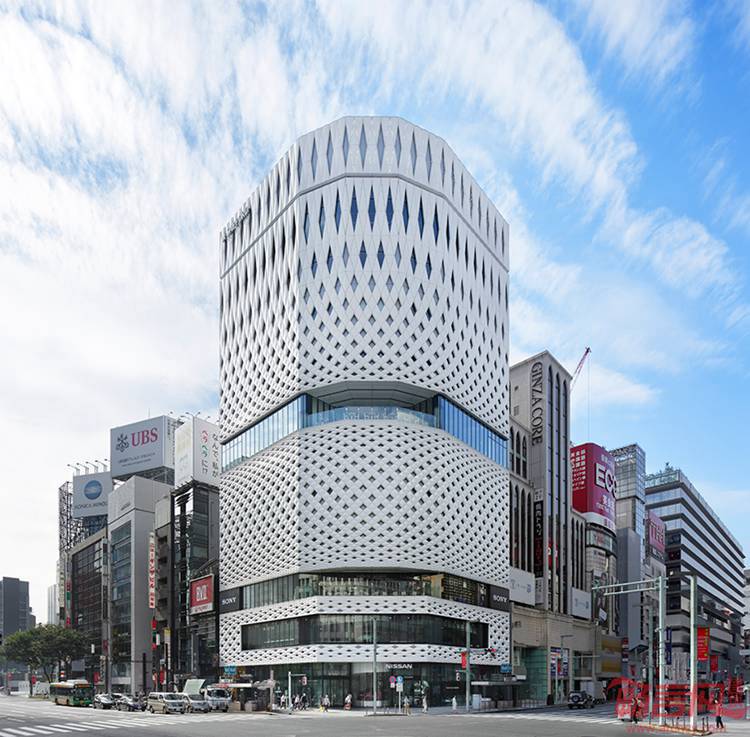 Klein Dytham设计了银座商厦,坐落在东京市中心一处显眼的街角。银座是著名的高档购物、艺术街区,该建筑带有张扬的外立面,灵感来自传统日本透雕工艺。表皮通透柔韧,不均匀地覆盖了建筑,将大片外立面分割成一个个较小的部分。
