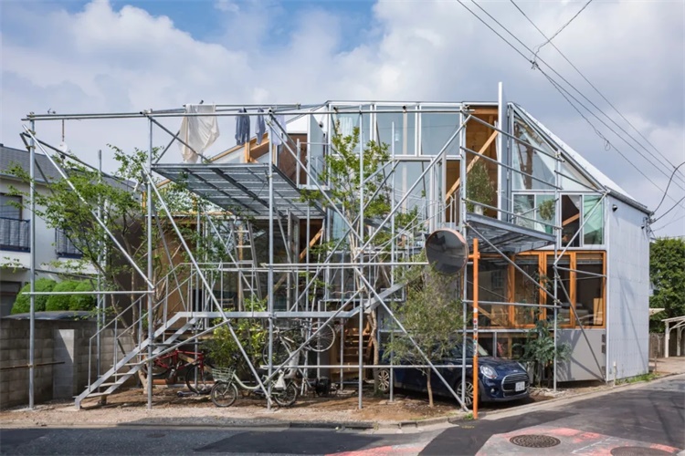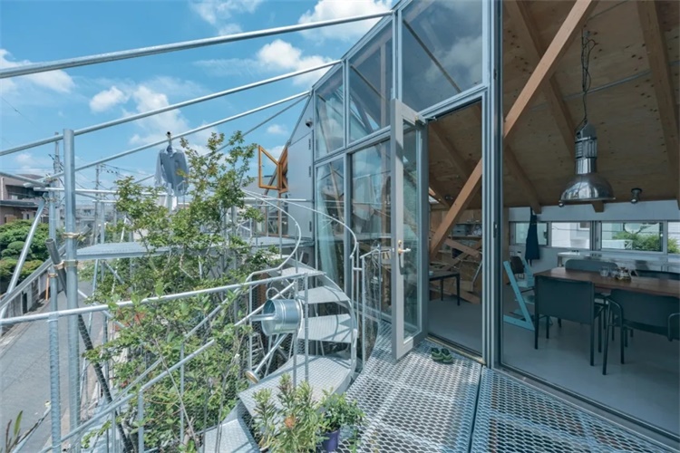 用脚手架搭出4层立体庭院,某些单管管道可以轻松连接和拆卸,从而可以根据日常生活需要进行修改,例如更改露台入口的尺寸或为绿化种植创造空间。