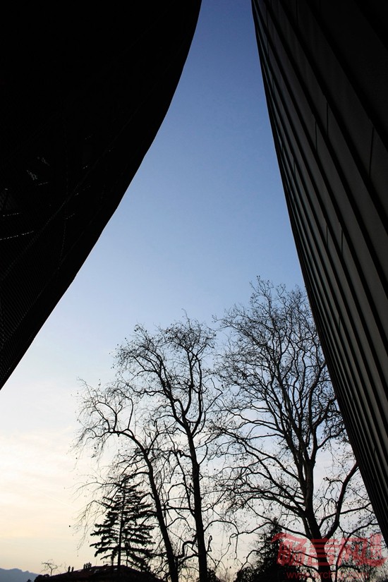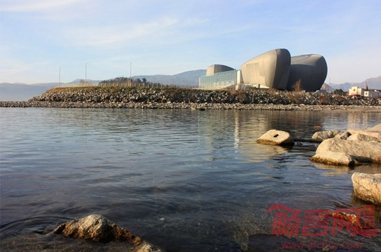 建筑师采用锌板来包覆这四栋不规则形状的建筑体,并且选用了与周围石头颜色一致的浅灰色调。四栋卵石状建筑体由一个临湖的直线型建筑连接起来,并且该直线型建筑的玻璃外墙朝向韦尔巴尼亚市区。