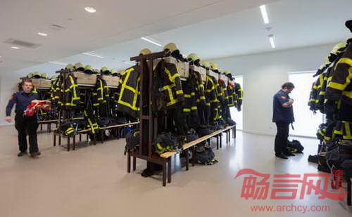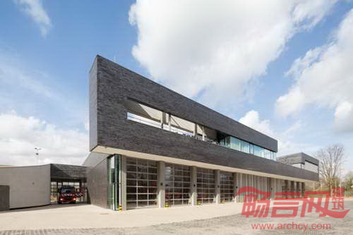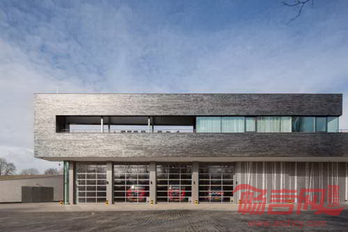 Doetinchem消防局建筑结合了可持续性、功能性和设计美观的办公环境。Doetinchem消防局24小时运行,建筑容纳了办公、公共、休息等多种设施。具有多个视野的空间排列显得清晰透明,使访客能够看见消防局内热火朝天的工作景象。结构稳固的建筑如同绿野中的别墅,取得了A+级节能认证。整个设计流程中均考虑到可持续性及对环境的融合。消防局位于Doetinchem主干道旁,水平排列的建筑具有简洁线条和表面,周边是茂密的树林。建筑涵盖一层的救火车存放区、工作台、洗车房,二层的宿舍区,三层的办公、休闲、健身和公共区。