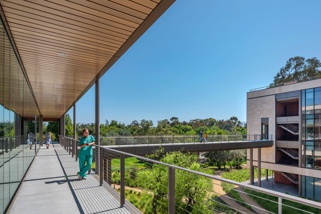 项目是斯坦福大学医学院与帕洛阿尔托临床校区和植物园之间的一道门槛,旨在为其周围的医务人员提供喘息的机会,以适应他们的学术和研究工作,并提供办公室、会议室、协作、教育空间、健身中心和餐厅风格咖啡店。