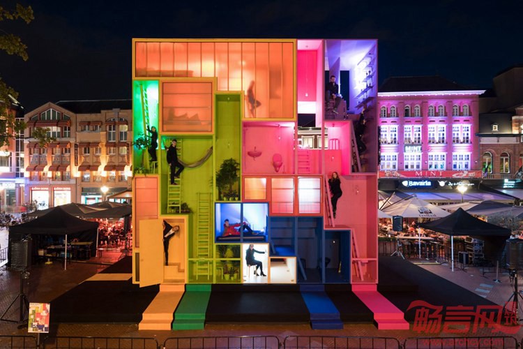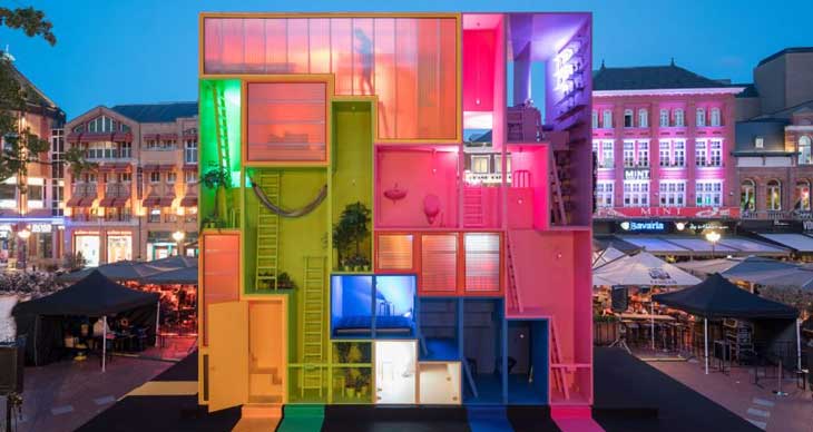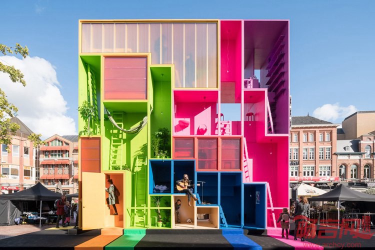 荷兰MVRDV事务所设计了一座五彩斑斓的未来主义酒店,包含九套客房,可被放置在不同的环境中。2017年埃因霍温设计周期间,事务所呈现出Wego概念方案,可适应未来住户的多种需求,住户可以是家庭,学生或者是难民。每座多彩住宅均面向不同的住户,其中包括活跃的带有格子的紫色空间,荧光绿包含梯子和吊床的单元,桃红色多层复式和亮黄阁楼空间。