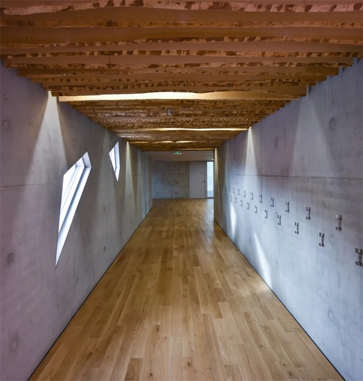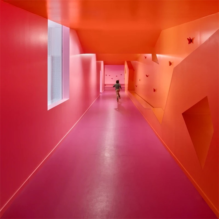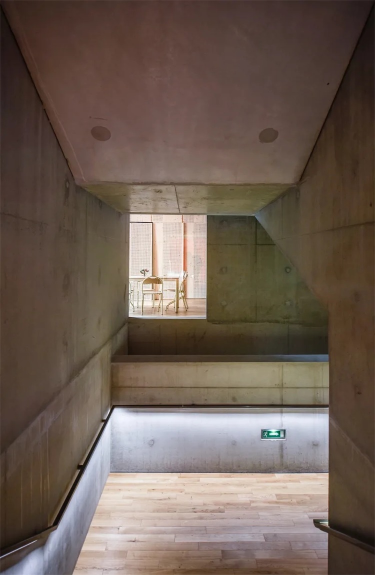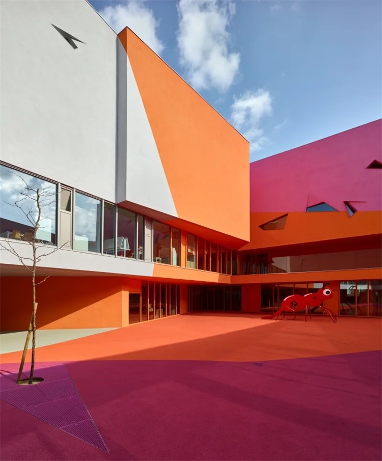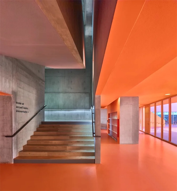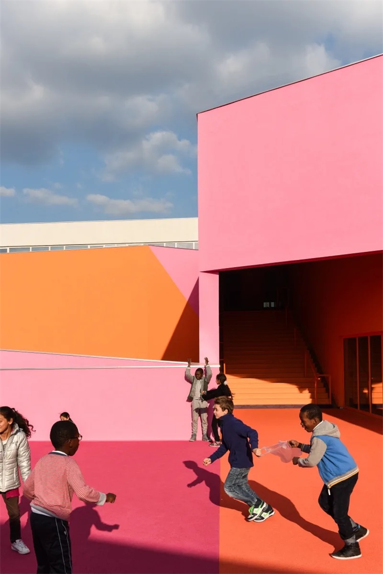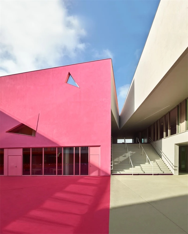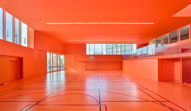 建筑有三层,地块很小,屋顶区域用来安置小学教室和花园。项目还包括体育场、食堂、图书馆和校外托儿设施。建筑墙体很厚,立面孔洞起到了镶嵌面的作用,吸引光线并反射。交通路线都是横向设置,路线多样化,光线明亮。露台成为建筑中心,将自然光带入室内。