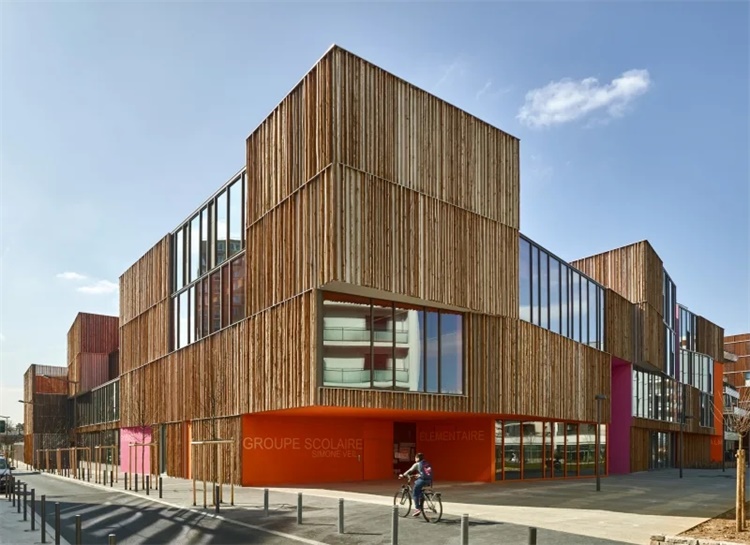 位于巴黎西北市郊的“西蒙尼面纱”学校建筑群构成了新生态社区城市的结构要素。项目紧紧嵌在密集的城市结构中,对面是一个公园,贯穿新建有轨电车线路维修车间区域。