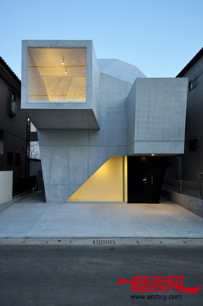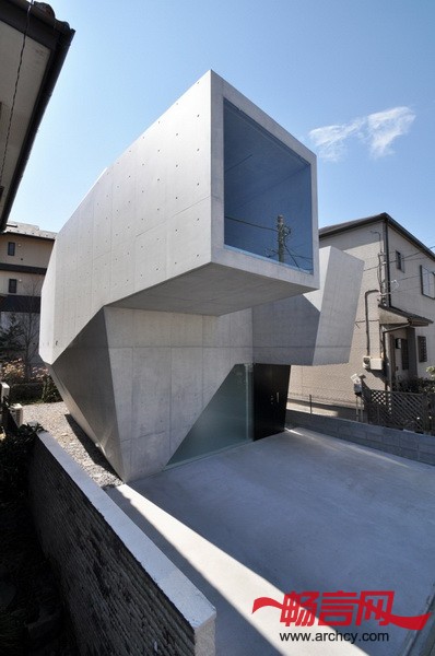这个混凝土结构占用空间很小,但是里面的起居室、理发室和洗漱区的空间都很宽敞。住宅结实的结构让玻璃和外墙形成同一个平面,这也突出了住宅的多面体构造。