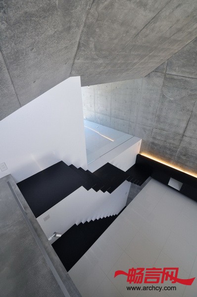 建筑地块在两个高地之间,这里的土壤十分柔软,所以,要在钢筋混凝土结构下面加一些桩子,用以固定和支撑整个结构。为了减少成本,设计师让住宅与地面的接触面积尽量达到最小,这样就可以少节省一些桩子。同时,上部的结构悬臂出来。各个空间的墙壁和屋顶形成了一个三维的倾斜平面,应力传递就得到了合理的处理,也给住宅一个十分特别的外形。