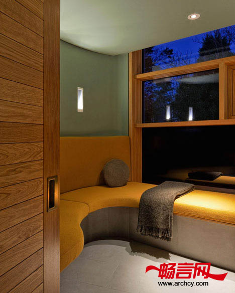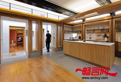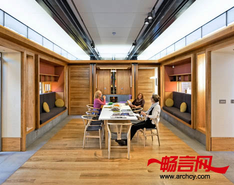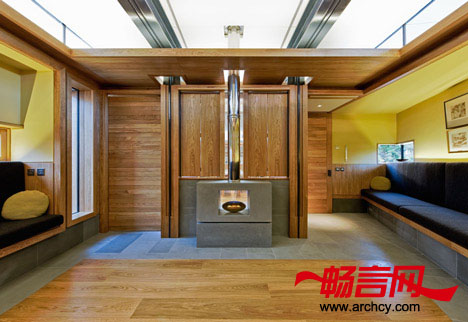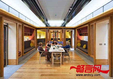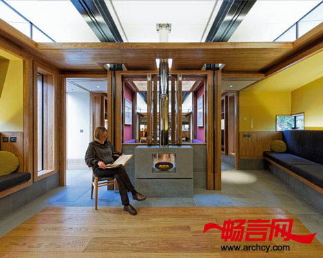 公共房间的两侧分别是一个壁炉和一间厨房,在这个房间的前方有一个私人会议室和一间治疗室。