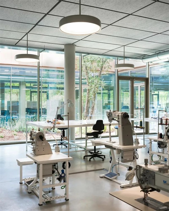 建筑师以创新手段设计了这座单层水平延伸的建筑,创造一种由生产过程需求所驱动的自由形式。由此,空间的实用性成为了场地规划的概念原则,将不同功能结合在一起、合并成水平穿越的流动通道,即一条带有透明墙壁并串联空间的骨干;其也在视觉上将不同功能空间加以统一,鼓励人们四处走动和社交。该工厂综合体设有管理和行政办公室、餐厅、生产仓库、车间和高级皮具学校,旨在充分体现奢侈品牌的卓越品质和高标准。