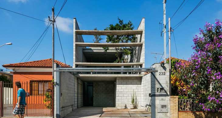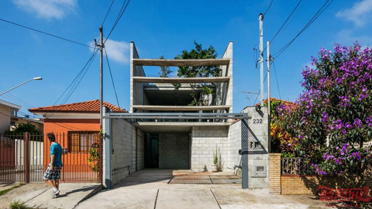 巴西Terra e Tuma工作室设计了圣保罗郊外的Minibu别墅。项目所在地是一片密度很高的住宅区,周围是一片红砖屋面的低层住宅,这是一座细长的城市建筑,拥有混凝土墙面,房间均围绕两个内部庭院而设。设计师表示,房屋体现了圣保罗一种普遍现象——场地狭长(5.6*30米),只有正立面都有其他周边建筑干扰。