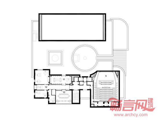 建筑外部呈立方体形状,由砖块装饰,形成类似织物纹理的图案;而内部则仿佛一件奢华夹克的衬里:光亮而且如天鹅绒般的柔软、平滑。采用的建筑材料有陶瓦、混凝土和处理成陶土颜色的水磨石等。