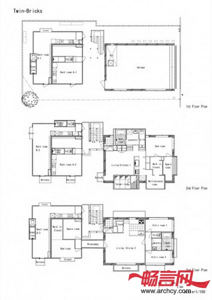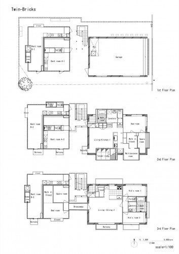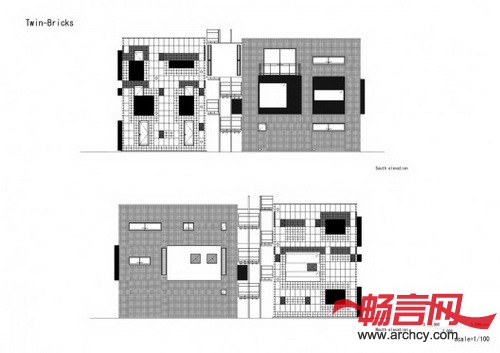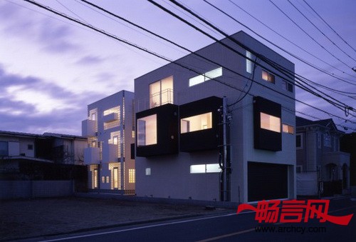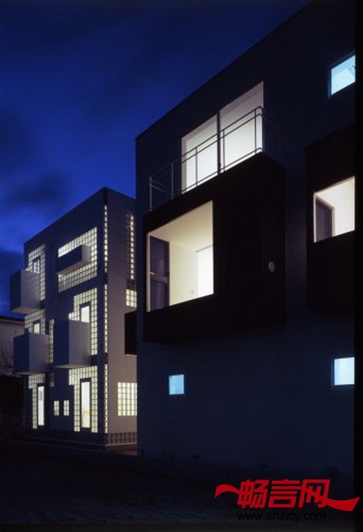 连体砖墙住宅包括两个翼楼 --- 一座5个单元的出租楼房和一个主人自己的双户住宅。住宅位于一个非常安静的住宅区,距东京只有20分钟的火车路程。为了满足住宅主人爱好收集车辆的需要,所以主人翼楼(RC翼楼)比出租翼楼(S翼楼)要更加靠近街道一些。S翼楼使用砂加气混凝土(ALC)和玻璃共同作为幕墙。