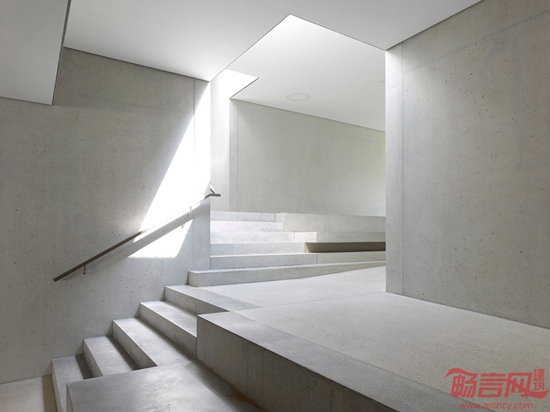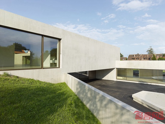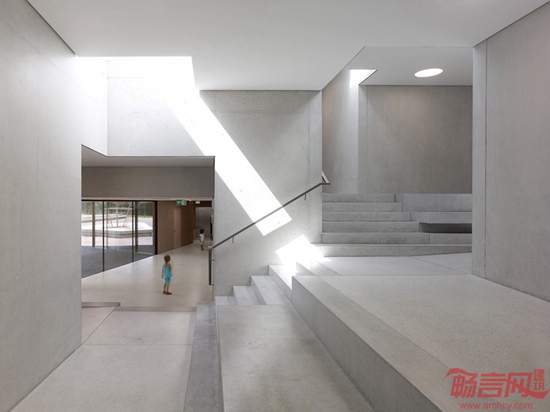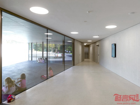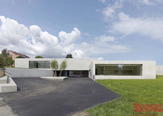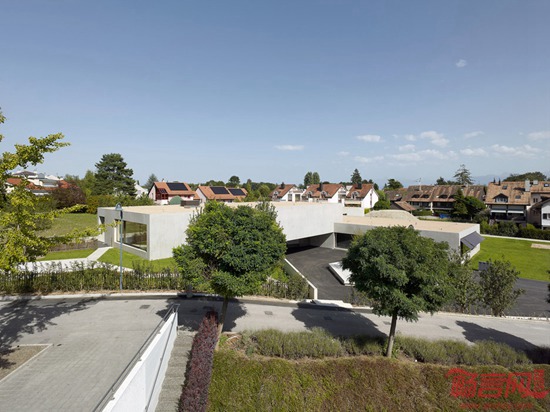 Pierre-Alain Dupraz利用清水混凝土材料设计了这所位于瑞士的十字形幼儿园。项目临近日内瓦湖Prangins,包含相互交叠的四座长方体结构,因此呈现出十字架型的平面格局。设计师希望通过这种布局减小建筑体量,缓和建筑对环境的影响。3/4的建筑结构位于坡地下方,另外则采用架高,营造出建筑玻璃入口之上的门廊。