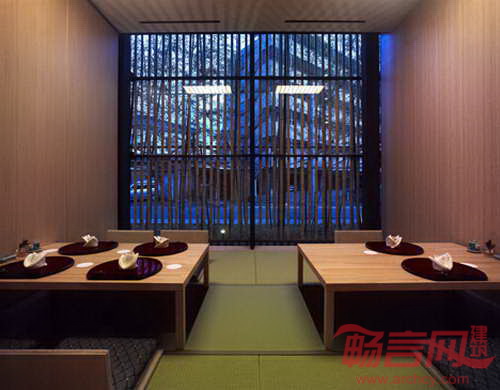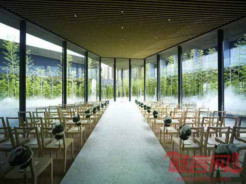 隈研吾事务所将酒店设计成一个“冷峻静谧的环境”,竹林景观和水景池为场地中央玻璃结婚礼堂提供了景观背景。
