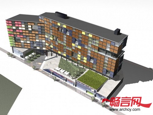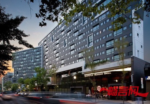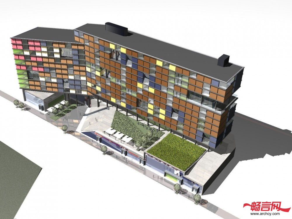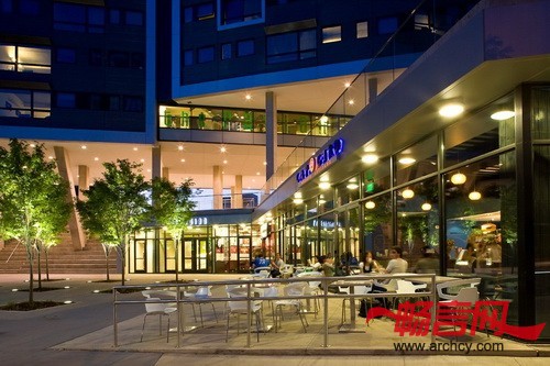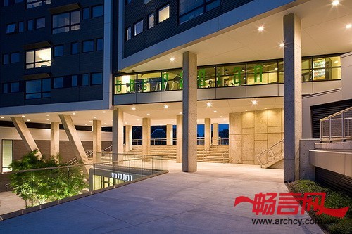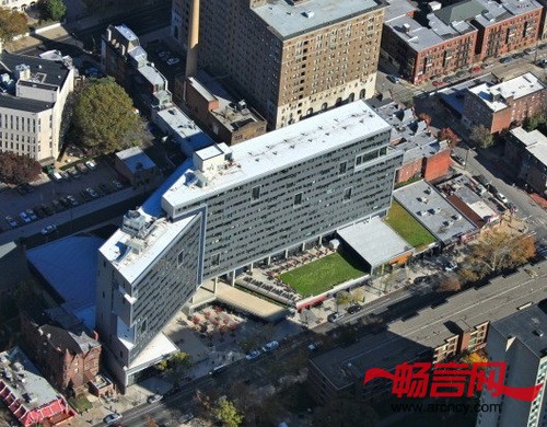 位于一楼的零售商店向内收缩,形成了一个开放型公共空间,为举行非正式的聚会提供了场地。住宅的入口位于建筑的主轴之上,公共活动场所通过一个大型楼梯延伸到住宅区域的底部。这个开放型场所沿着连接Locust Walk的胡桃街的南侧与四周的建筑对齐。室外用餐区设置在较高的露台上,在上面可以观看街头风景。