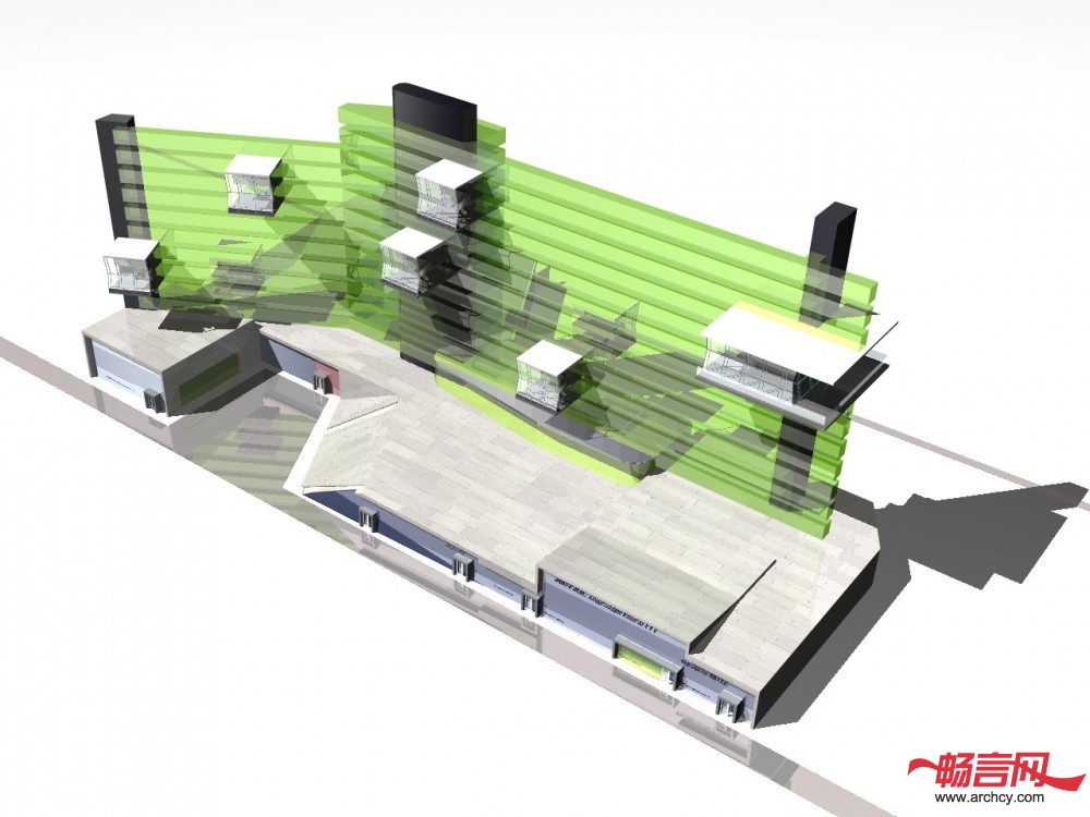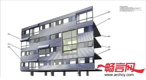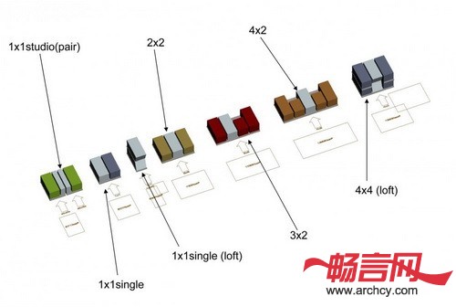 弧形公寓的模块化设计风格参考了宿舍楼单元设计的建造风格,但没有宿舍楼线条硬直的特征。每个公寓会安排一到四间卧室,并且每个楼层的安排都不相同。这个灵活的规划将带有一间浴室的公寓同带有四间浴室的公寓结合起来,创造了无规则的接合点,从而获得了一种意想不到的效果。这些接合点位于大楼的内部,从建筑外部透过嵌在墙上的窗户便可以看到它们,它们统一采用白色的带状幕墙装饰,围绕着整座大楼的结构分布。