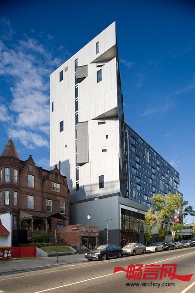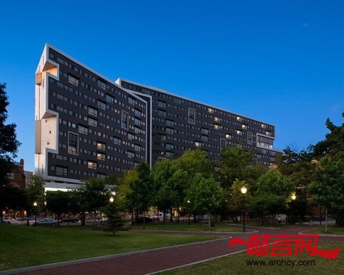 弧形公寓是一座14层高的住宅及零售中心,可以容纳500人住宿。它位于迅速扩展的宾夕法尼亚大学的边缘。弧形公寓的名字源于其外墙成一定角度的设计特点,此设计出自费城Erdy McHenry事务所。该项目由私人开发商和土地所有者宾夕法尼亚大学共同开发建造。它是一个具有争议的空间:因为它既不属于西费城琳琅满目的零售空间部分,也不属于宾夕法尼亚大学平和的教学楼部分。但是它优雅地模糊了这两种对立风景之间的界限,并且提升了这两个部分的氛围。