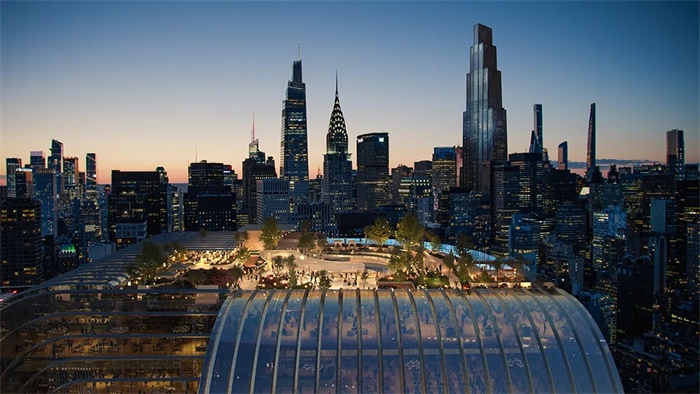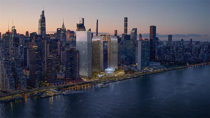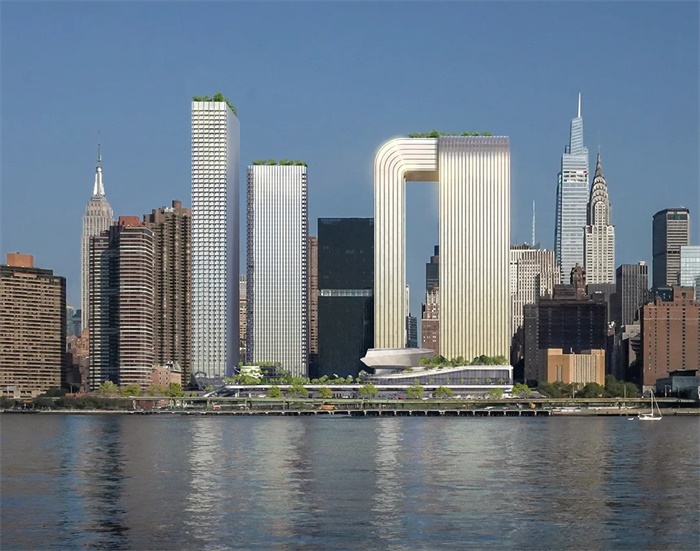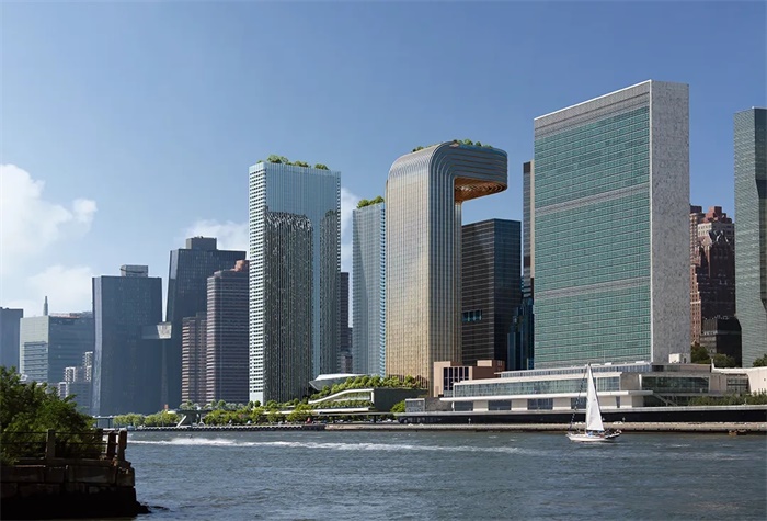 自由广场塔楼的布局延续了曼哈顿正交网格状的城市肌理,将视线通廊从中城向东延伸至东河以及皇后区。设计既尊重了北侧著名的联合国建筑群,又为滨水区增添了有趣的雕塑元素。两座住宅塔楼向二十世纪五六十年代纽约市的现代主义建筑致敬,条形玻璃和铝合金幕墙在底部的裙房处相连,裙房将容纳美食集市及零售功能。两座酒店塔楼采用暖色调的金属饰面,并在屋顶处连接起来,在建筑之间形成视觉上的统一。