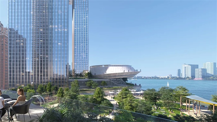 本项目由BIG设计,Soloviev集团和Mohegan公司开发。项目地块位于曼哈顿中城东联合国总部以南的河滨,占地2.7万平方米。该地块是曼哈顿现存最大的未开发地块。BIG设计了博物馆、裙房以及四座塔楼,这四座塔楼围合出的公共绿地则由景观公司OJB设计。两座分别高50层和60层的住宅塔楼将提供1325套公寓,其中近40%的公寓将被指定为永久保障性住房。另外两座51层高的塔楼将容纳纽约市首家五星级Banyan Tree酒店和Mohegan酒店,以及一座会议中心和一座娱乐中心。