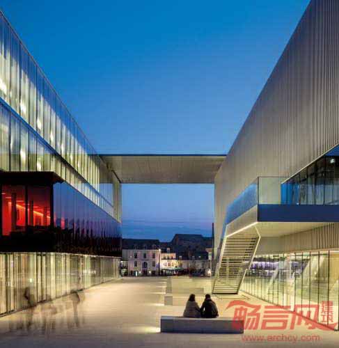 蓝色缎带外观的城市剧场位于场地右侧,外墙使用了竖直条纹的玻璃幕墙。场地左侧是优雅的白色石材影院多功能建筑。