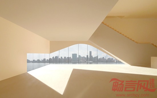 面朝曼哈顿壮丽景致的东河基地启发了设计灵感,该设计将室内主流动路线切入西立面。一个“曼哈顿风光”楼梯自开放的到达区立起,给了使用者一个朝向城市的巨大的美丽视野。楼梯侧面是垂直排列的书桌,在逐层上升的剖面可看到摆满书册。自入口处能见到书籍满目,而拾阶而上则可俯瞰东河,欣赏到曼哈顿的景色。