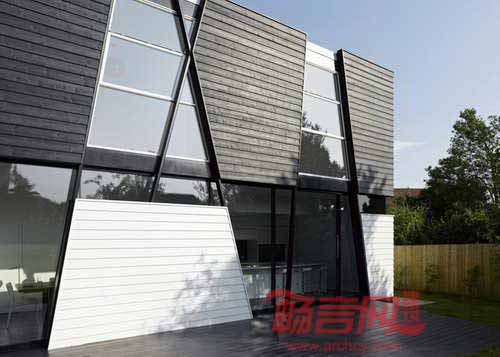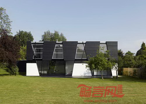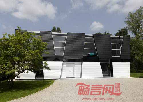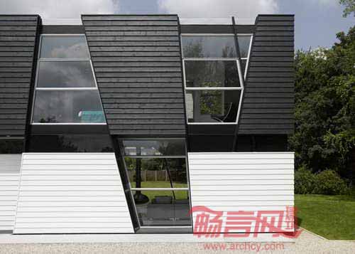 英国建筑师Heywood设计了一座外墙模仿弯曲枝干的黑白色住宅。项目位于英国肯特郡一个小村庄,共有五个房间,设计师希望建筑能与周围树林环境相互融合。项目采用了斜柱构成外墙结构,令人联想树林中交叠排布的枝杈。
