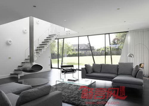 建筑师表示,“外墙中间隔设置了大玻璃窗,住户可以尽情欣赏林中美景,这种感受如同透过树枝的缝隙观察一样。”住宅覆盖了黑白两色护墙板,这种装饰风格在英国该区域十分普遍。这种外墙板如同树叶包裹了建筑和室内区域。