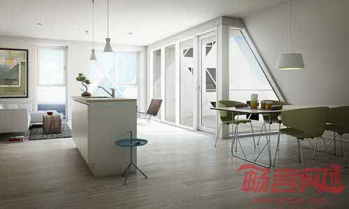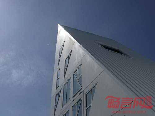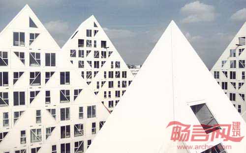 设计灵感来自漂浮冰山的形状,项目名称含义即为“冰山”,阳台采用了从深蓝到透明色的渐变玻璃,熠熠发光的外观展现了北极气候影响。一层中,两层排屋融入了多样化三角形建筑体量中,楼顶套件位于建筑顶端或者高耸的塔尖。建筑立面呈现出自由组合的三角形,材料是水磨石,使建筑宏伟大气,阳台地面的热带树木板材与整体的严峻感形成对照。