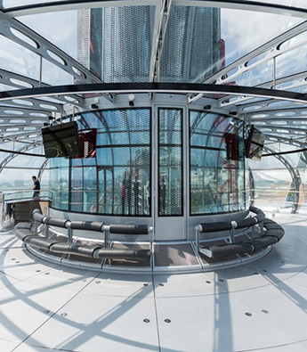 经过11年的设计开发,这座观光塔在刮风的天气条件下也可以运转营业,带孔的铝板可以减轻塔体因风力而产生的震动。此外,塔体内部还安装了减震装置。高尖端科技的缆车驱动系统带动观光平台升降,而且,驱动力还来自于平台下降过程中产生的能量。平台每次可容纳最多200人,游客可在平台内任意走动。
