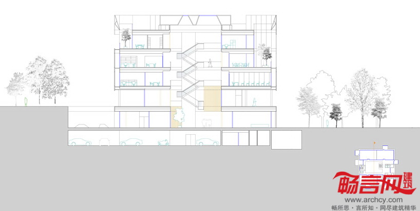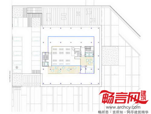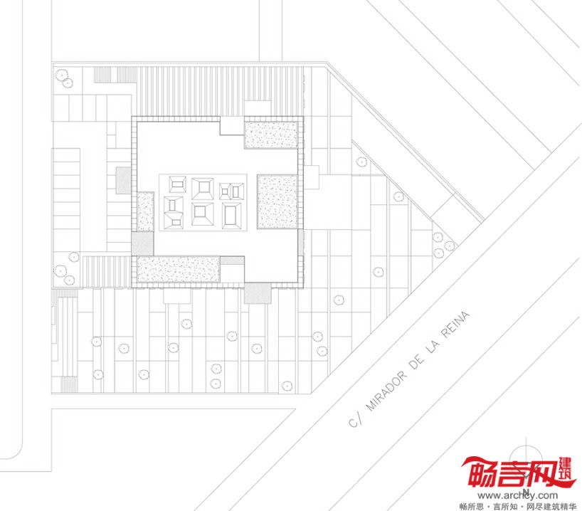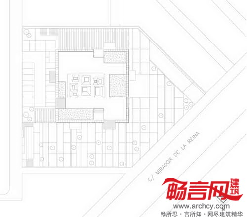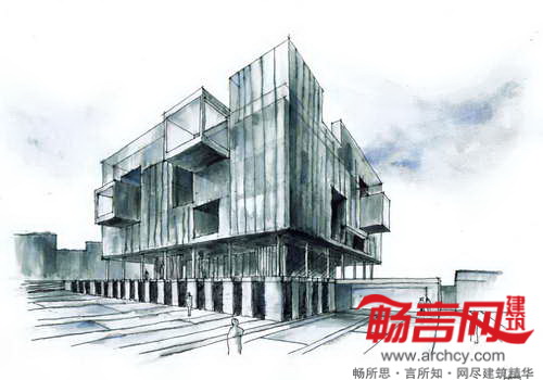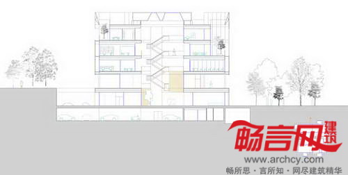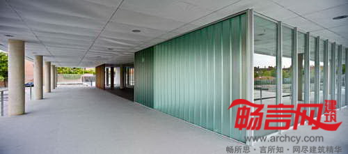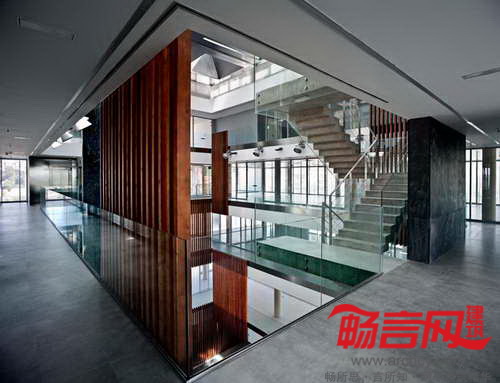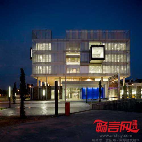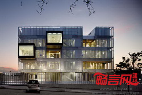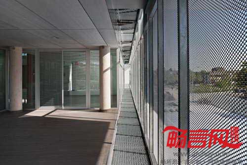建筑地界线后退,以符合城市规划发展要求。最具个性的一点在于——电镀铝丝网,上有能够控制景深和光线的穿孔。这些网格板在白天时阻隔了通向室内的视线,而从建筑内部往外的视线则畅通无阻。晚间,建筑灯火通明,将内部设施展现给外界。建筑四周设立了一些天然石材围栏;同材质的石材内部凿空,使用黑色大理石和木材穿过。