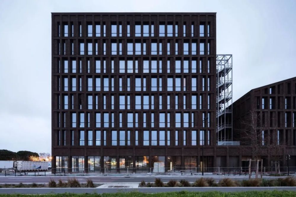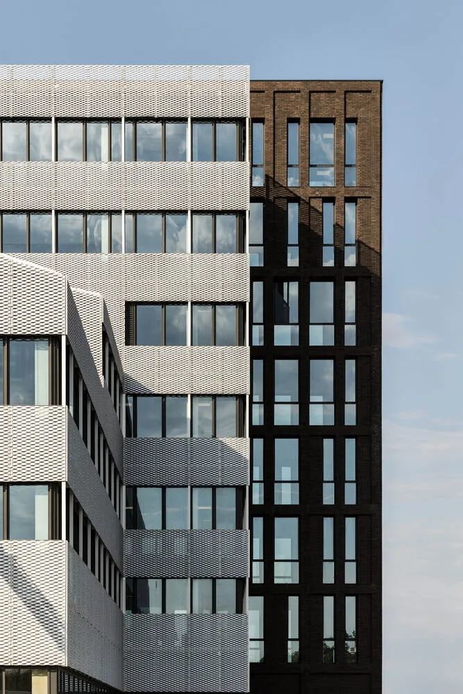 建筑设计的原则也反映在立面使用的两种材料中,即砖和金属。沿街的砖立面强调了建筑与城市的关系。手工铸造的陶土砖的不均匀性,以及它的棕色,给了建筑一种独特的感觉,立面的整体图案和使其充满活力的窗户更加突出了这种感觉。