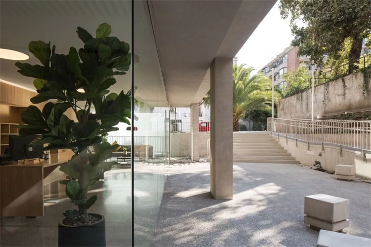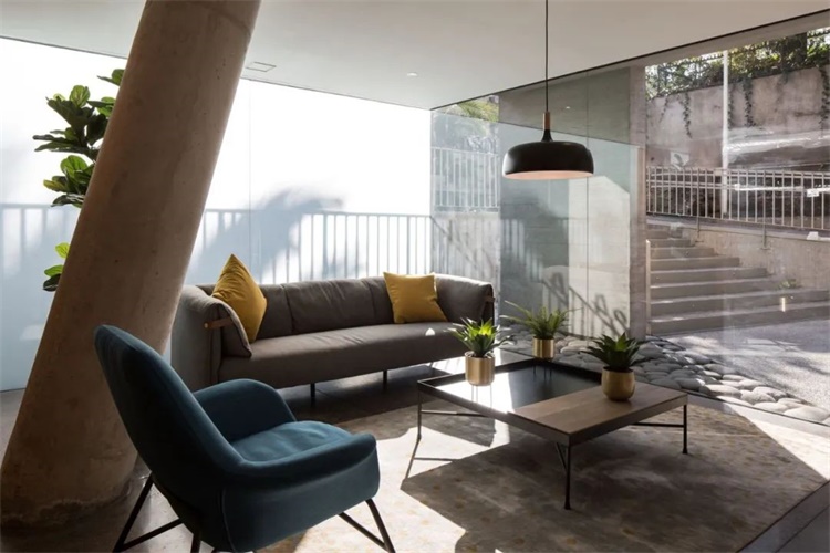 公寓的立方体量是由建筑高度与边界和街道轴线的最大角度决定的,这是为了符合当地的城市建筑规范。建筑更贴合地面,这给社区,尤其是住宅区域,一个安静的环境。由此产生的建筑体量,其重量通过使用裸露的混凝土来强调,通过薄的屋顶板,强调水平线条且精致的立面设计,二楼的退台设计来平衡。建筑的一层由玻璃和透明空间构成,向城市开放,作为公共空间的延伸。