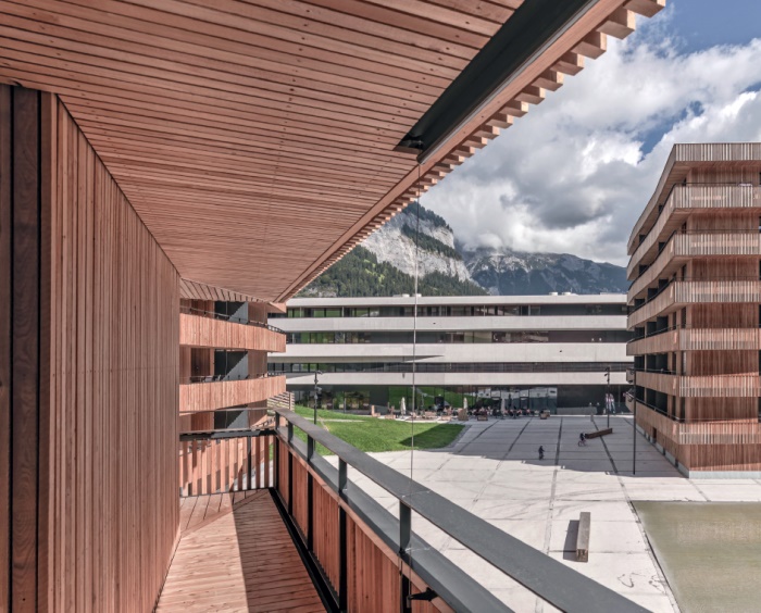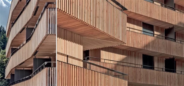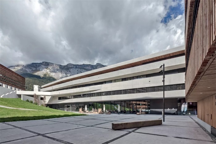 本项目三栋住宅楼依托地景,打造了一个人与自然紧密相连的舞台。社区中心建筑的体量强势介入场地,在尺度上又保持克制,并且把原有的连桥整合到结构与功能中,使其成为弗利姆斯新的地标建筑。社区中心的三层建筑设有咖啡厅、商店、公共服务设施、餐厅和酒店。建筑强调水平向的延伸感,象征着阿尔卑斯山的地质构造层,并由此阐释了建筑的透明性和体量感,以及抽象而又含蓄的形体表达。支柱锚固在混凝土中,形成巨大的支撑框架,为未来的可持续发展提供经济而又便捷的可能。