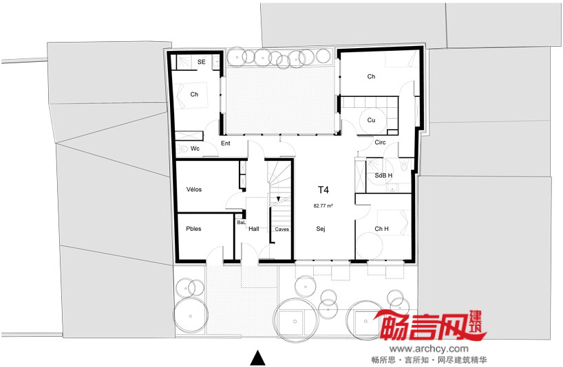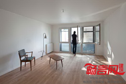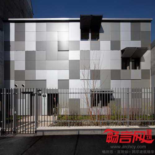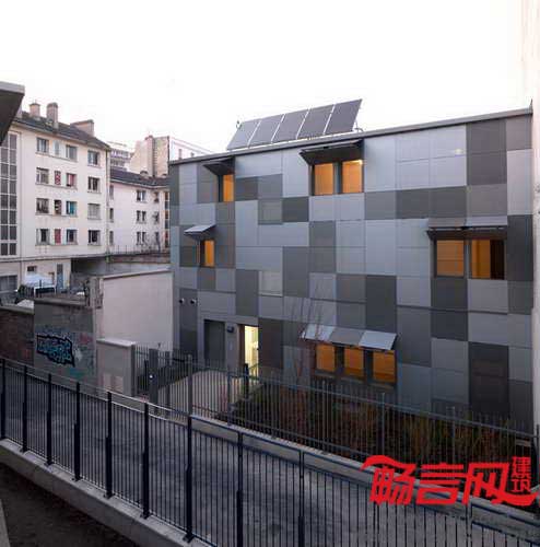 法国RMDM建筑事务所最近完成了一项“十套高性能公寓”的设计,公寓属于社会福利房,位于巴黎十八区,周围正在进行城市改造工程。公寓给低收入群体提供了住所,户外有休闲区域,为公寓和拥挤的周围建筑之间创造了绿色缓冲区。入口立面外墙有垂直的铝丝网,三种色调从白到灰,活跃了外立面,使建筑从被隔绝的周围环境中跳脱出来,还能有效调节住户的日常生活。铰链结构使得窗户能从多个角度开合,满足住户隐秘需求,并遮挡日晒。生活空间设在公共空间上方,而屋顶则安装了太阳能板,颜色与建筑外立面相协调,能为公寓供应热水。
