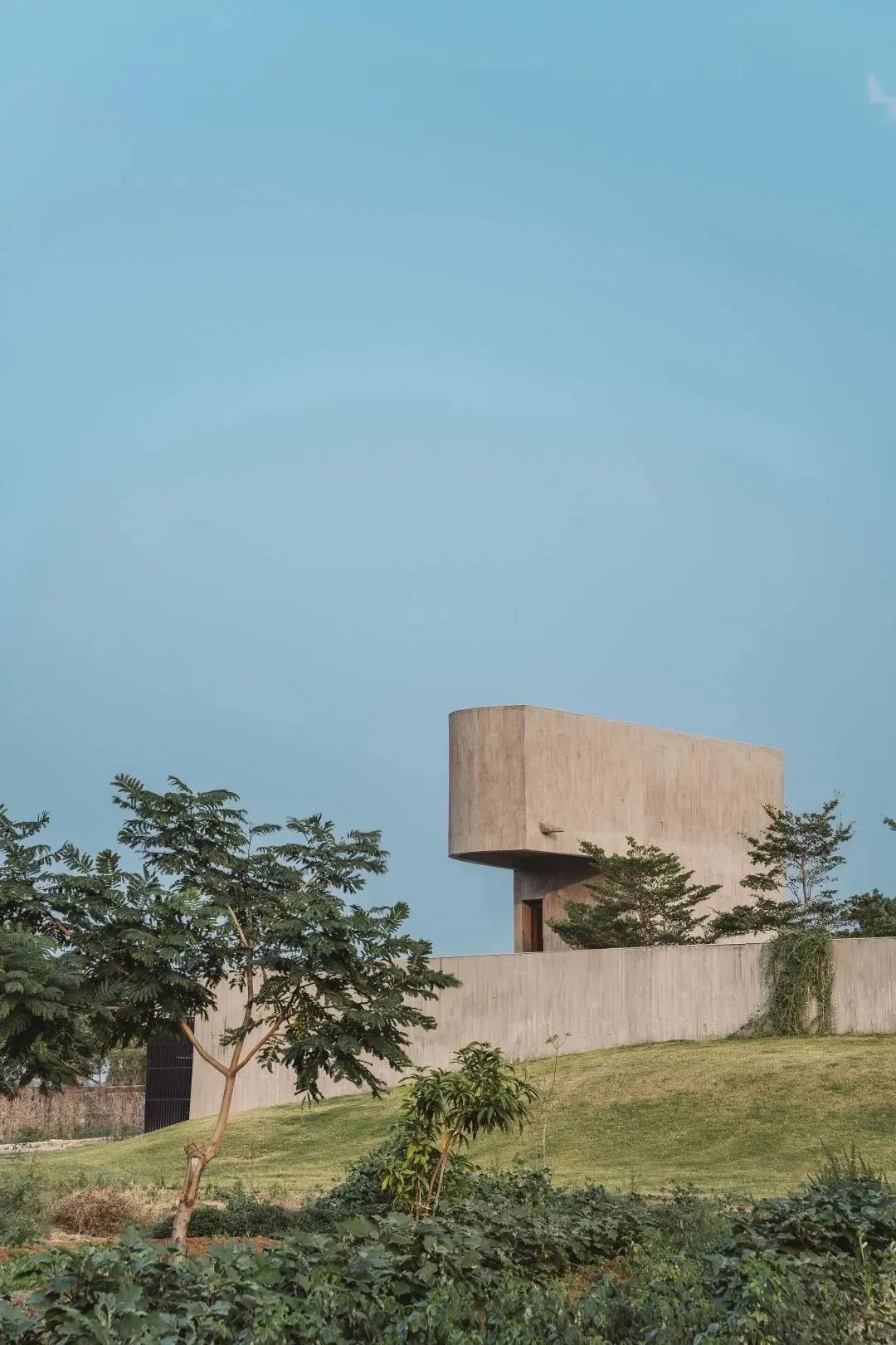 建筑被两个曲面和两个直面外墙包围,并在交汇处脱节,创造出进入邻近景观的微妙入口。两道弧形墙的交汇始于一个入口顶棚,这种流动的、原始的纹理,凭借其与柔和的白色石膏墙和周围的绿色植物的对比,引导人们在连续展开的空间中移动。