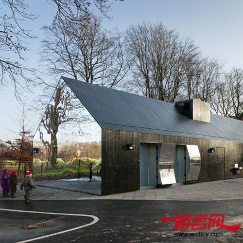 哥本哈根MLRP建筑事务所将操场上的一个墙上满是乱画图案的厕所修建了一下,修建之后,它的外观好看了很多,而且能映照出周围环境。