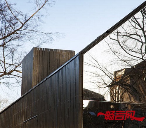 门和窗与百叶窗之后的木板幕墙融合起来,镜子弯曲成不同的弧度,形成不同的影像效果。
