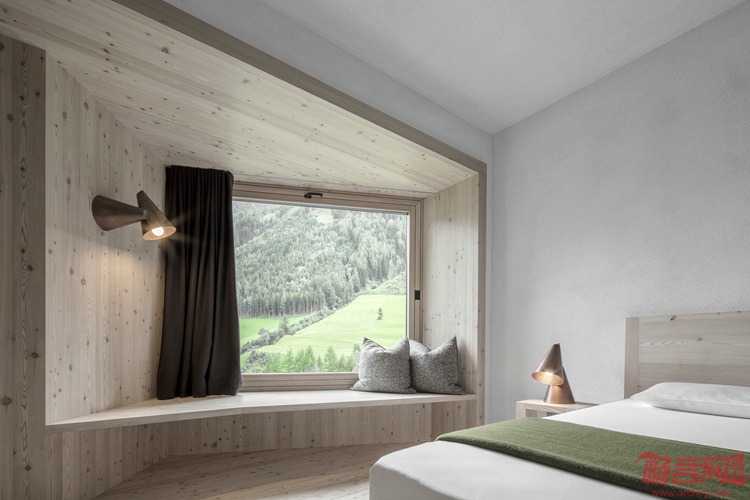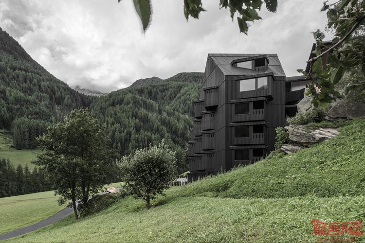 已有酒店大楼坐落在意大利Buhel海拔1200米的高地上,新建建筑位于其东侧较低的位置。这一徒步者酒店扩建位于地块的北面,因此原有建筑不会在使用或光照上对新建筑产生影响。不对称的鞍状屋顶同周边的山丘形态吻合,同时满足空间布置上的灵活性。这一六层项目包含20个客房,水疗Spa和餐厅。外立面是黑色釉面松木板,营造了同阿尔卑斯山环境的互动。不过,当地材料赋予建筑温暖的光泽。地面采用附近森林的树木制成,室内装饰还用到当地铜矿出产的原料。
