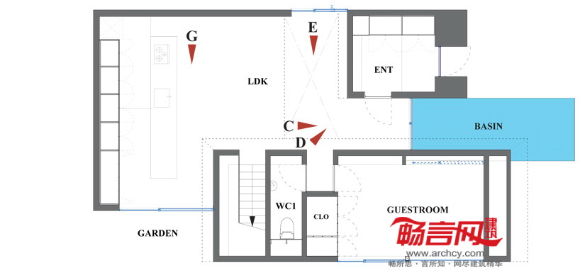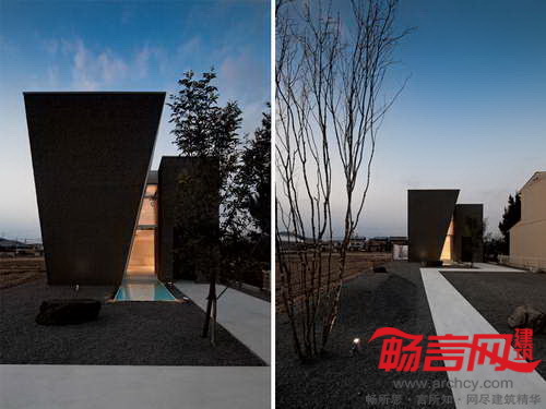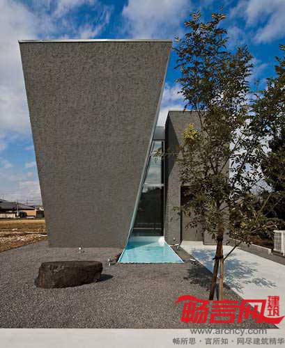 Keitaro Muto建筑事务所最近完成了一处位于日本岐阜县羽岛的“Ginan住宅”设计——围绕着将房屋和场地整体打造成花园的设计理念,设置了一条窄长的车道通向住宅的入口,道路两旁铺砌了砾石,上面的树木和巨石是从房主前住所搬运过来的。建筑外墙边缘呈斜线型,材料采用了黑色卵石,从而将景观区域使用的材质延伸到了建筑结构中。