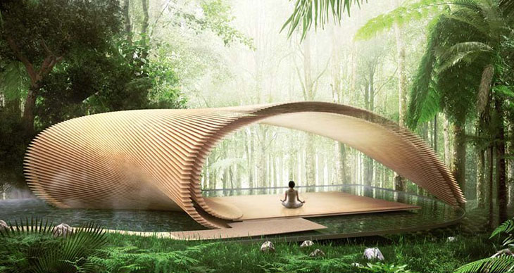 隈研吾构想了位于印尼巴厘岛最南端Bukit半岛的别墅系列项目。总体上,项目涵盖留作名为Tsubomi的别墅,建在缓坡上、俯瞰印尼海岸、位于砂石悬崖的温室和瑜伽馆。设计方案旨在使建筑同环境相融合。其名称来源于日语,意为“花苞”,这一形式体现在夸张的抛物面屋顶天棚中。