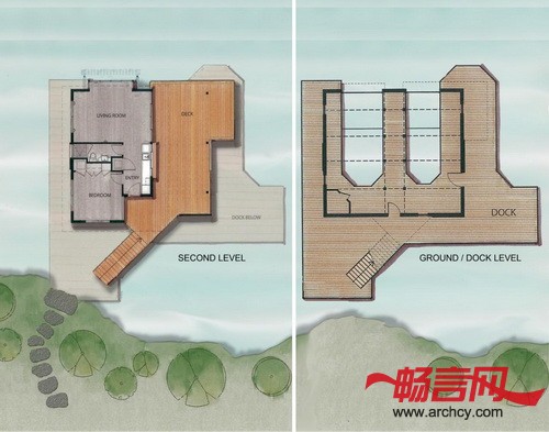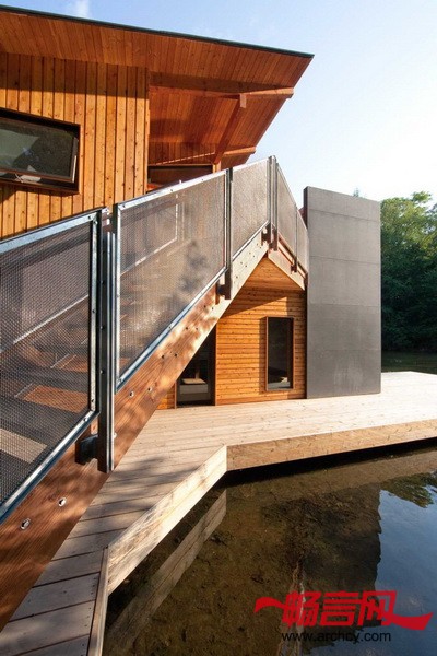 设计师在底层的室外新加了一个楼梯,它连接了一层和屋顶露台。屋顶露台面向西南,它是户外区域的聚集地点,也是整个船库的中心点。二层是一个生活小屋,里面有一间卧室、一个洗手间、一个厨房和起居室。