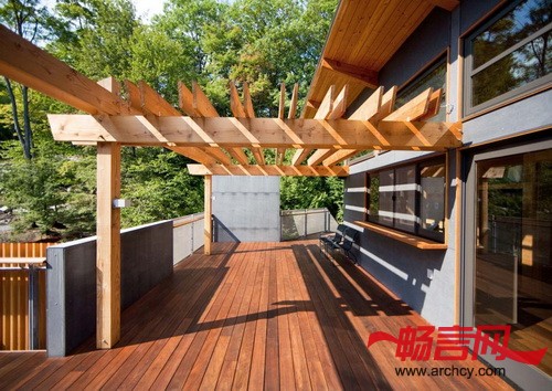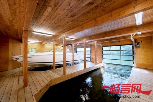 船库主空间的外墙用清晰着色的西部红松做成。水泥板和花旗木帘为室外露台提供了良好的隐私。