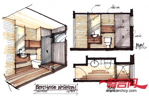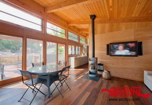 小屋将农村材料和极简派艺术设计融合在一起,形成了非常现代的室内空间。它用混合梁柱式的木立柱框架结构做成,外面用花旗松椽木做成屋顶和露台平板。小屋的第四面用木立柱和窗户架在另外三面上,它朝向屋顶露台展开。整个小屋上面都使用了花旗松胶合板,室内室外都用重蚁木地板和装饰完成。