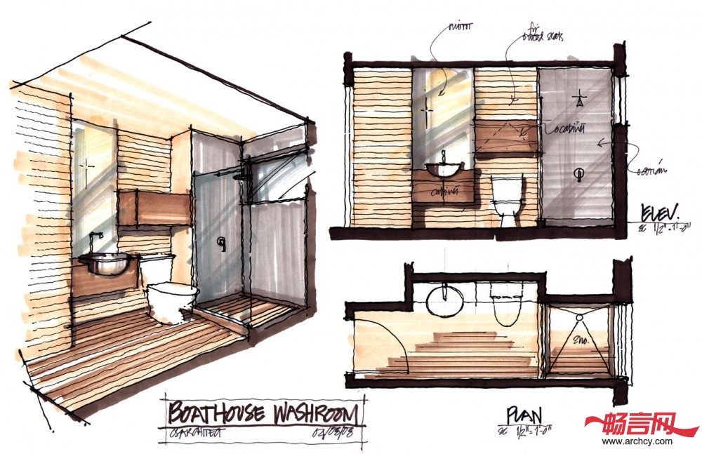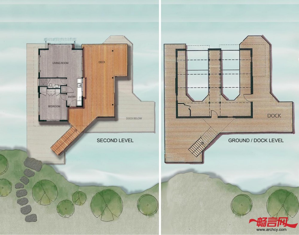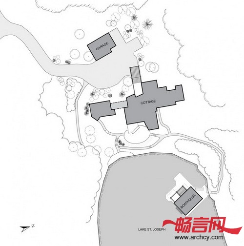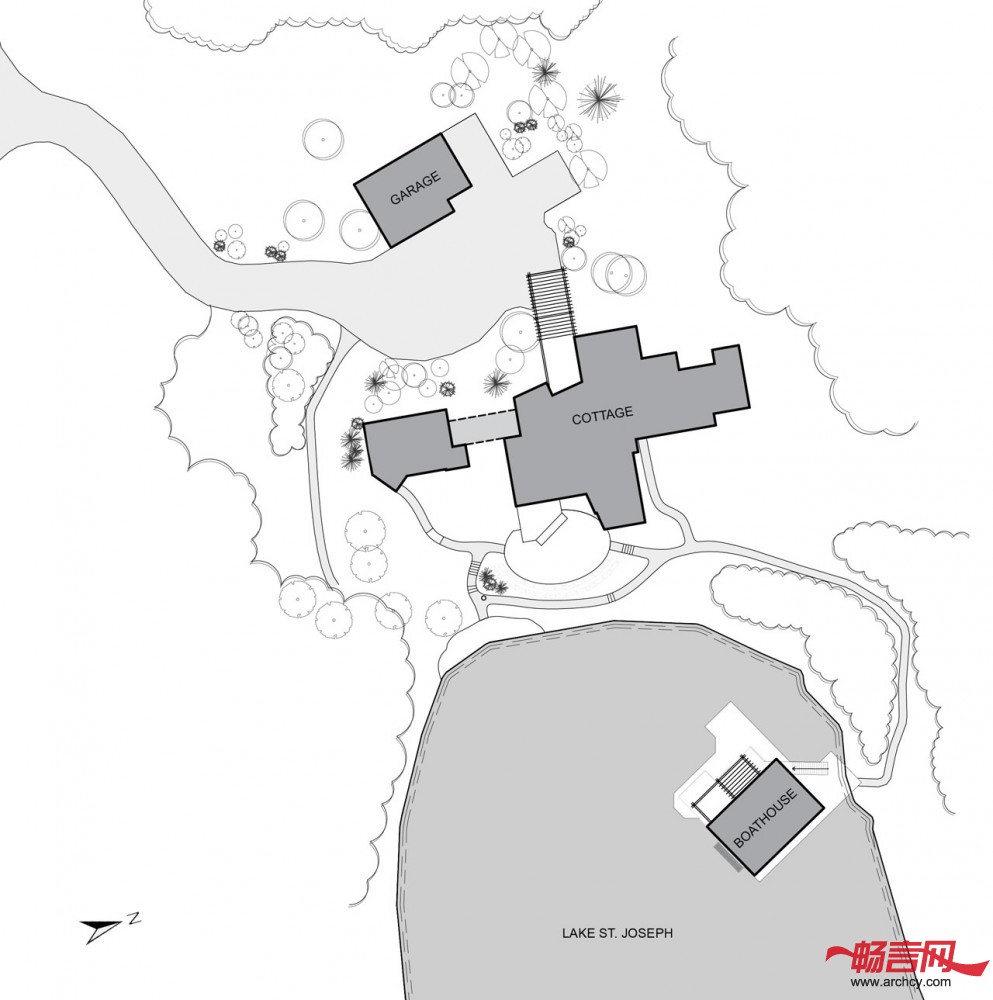 此项工程的任务是对一个旧船库进行修理,并新建约57平米的二层宾客套房和一个屋顶露台。项目的地址在蒙特利尔的马斯科卡湖(Muskoka Lakes)地区,位于一个狭窄的海湾尽头,新船库的设计既保证了有宽广的观湖视野,又与海湾封闭的森林岸边相连。