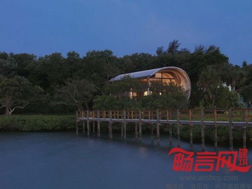 岛上橡树林的东边有一座造型奇特的房子,房子的另一面就是红树林。这座房子的屋顶和背部都是弧面形状,整体采用的是木质材料,设计师如此选材主要是受两方面的启发。