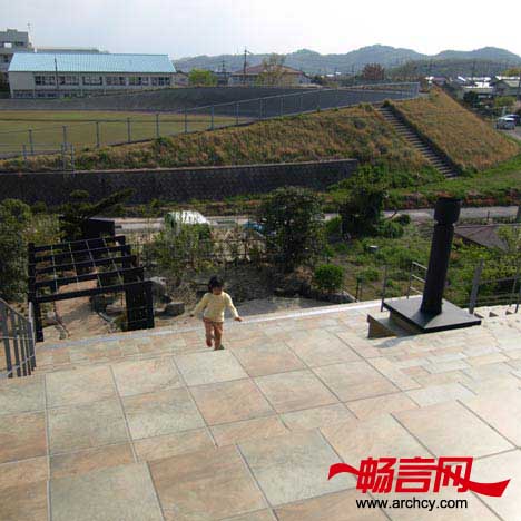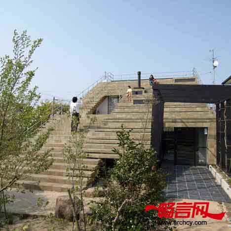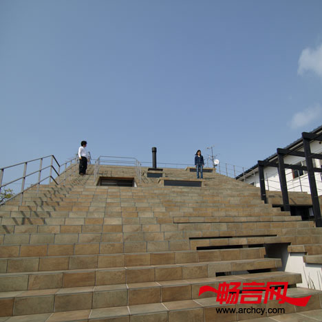 台阶形的住宅使人们自动的就朝上面看去,而不会给人丝毫的压迫感。台阶的表面镶嵌了瓷砖,这样就可以免于维护了。