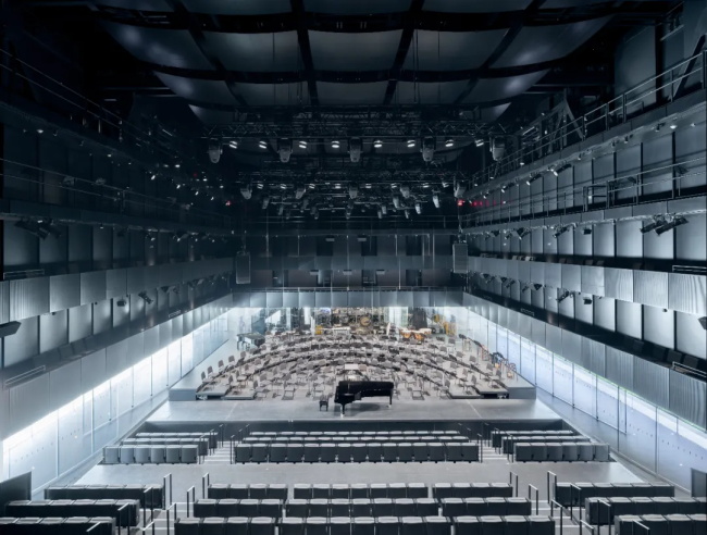 表演艺术中心开创了一种全新的建筑类型,其鞋盒状主厅的六个表面均能在物理和声学上进行调节,从而形成 5 种不同的舞台与观众席布局 —— 实验媒体式、独奏会式、镜框式舞台式、管弦乐队式和平地式 —— 以及一系列潜在的辅助使用模式。