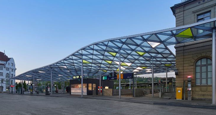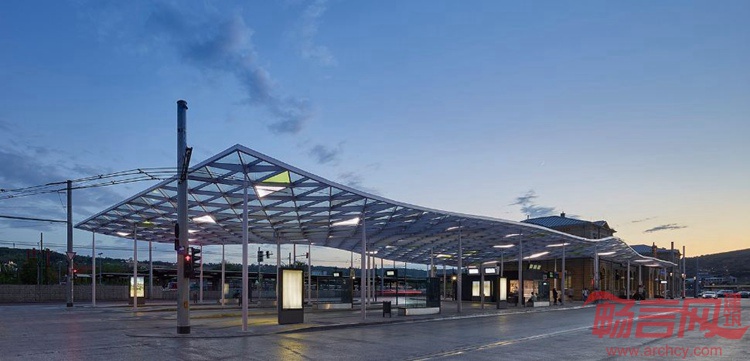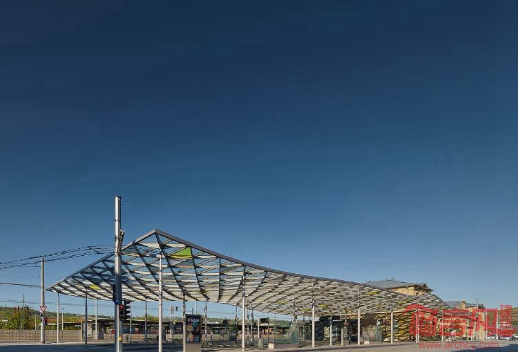 项目位于德国Esslingen,面积2000平米,于2014年建成。项目由Werner Sobek设计,是一个竞赛优胜方案。Esslingen中央车站通过一个新建天棚得到提升。设计师创造了弧形顶棚,造型来自周边的自然环境。通过长边的鼓翘,遮蔽空间朝向周围的葡萄园和小山敞开。屋面结构由单根钢柱支撑。结构由弧面钢架组成,基本原件是三角造型。