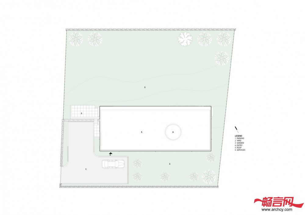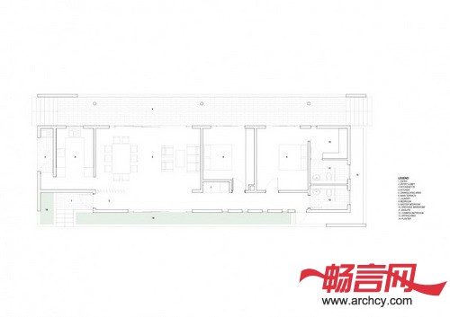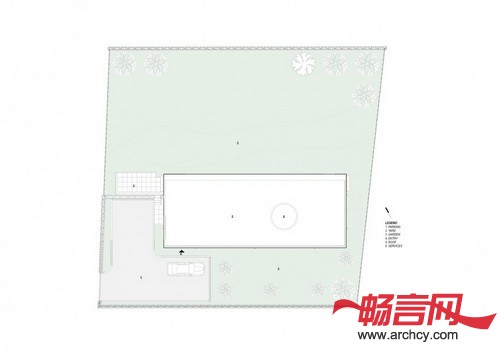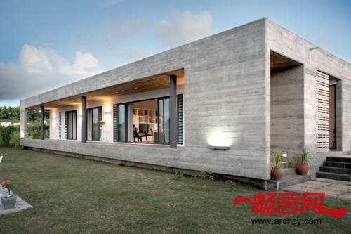 CG住宅位于一个农业地块上,占地1,000平米,在它不远处就有一片松树林。地块是长方形的,在一个南北走向的缓坡上面(两端高度差为1.5米),地上有岩石露出,但是周围没有树木。我们的设计就是建造一个两个卧室的住宅,这个住宅的所有房间都在同一层,而且保证能有最大面积的绿地,因为客户喜欢园艺,而且他喜欢在花园里招待客人和进行家庭聚会。客户是一个室内装饰师,她希望我们的住宅能够反映出她的设计偏好,并能让她在住宅里展示她最近的室内装潢设计。因为预算有限,所以我们需要建造一个功能全、维修费用低,又能保证住宅非常显眼、并和周围环境融合、同时又要从某种程度上体现农业色彩的住宅。我们使用了木板百叶窗和混凝土外壳,这样既与附近的松林相互协调,又保证了外墙需要很少的维修。