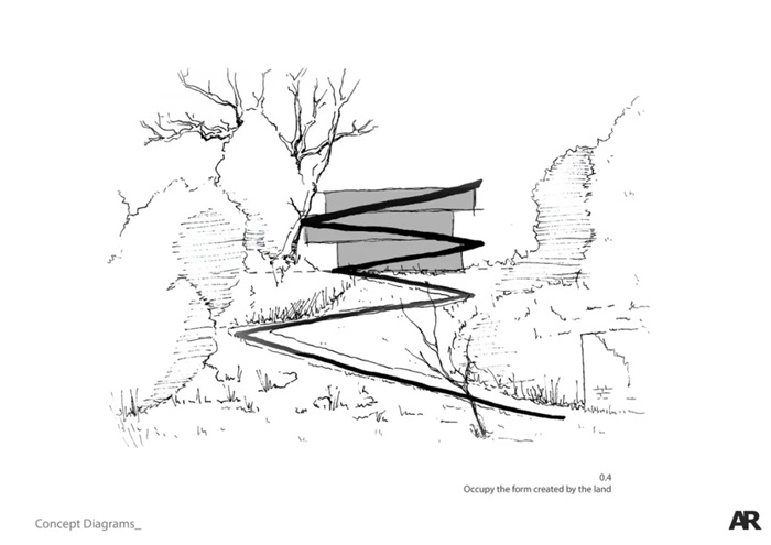 住宅设计理念始于现有的“zig zag”路径。该路径以折叠的丝带状呈现,从地势低位开始延伸至住宅建筑。